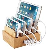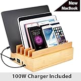 Bamboo Universal Multi Device Cord Organizer Stand and Charging Station for Smartphones, Tablets, and Laptops INCLUDES 5-USB port Hub Charger with Power Supply